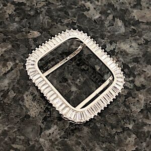 This sleek 14k white gold Crystal Apple Watch band and 14k gp and 14k white gold lab diamond Watch case has baguette and pave set round lab diamonds around the sides.They are custom plated in 14k white gold. It will fit a wrist from size 5.5mm the smallest up to an 7.5 inch. It has easy to remove links to adjust to your wrist size, no tools required. Ships with tracking numbers The Apple Watch is not included. All items are brand new and come in a gift box.