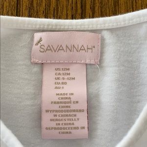 White top with ruffle bottom, grey polka dot leggings