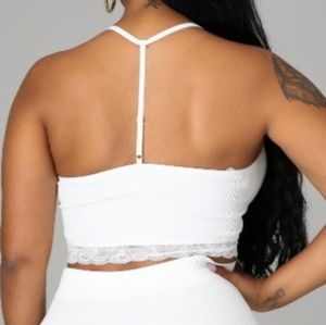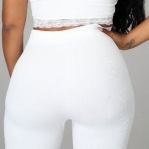 Ribbed 2pc short set with adjustable straps on the crop top. Top and bottoms have lace detail at the hem.