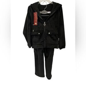 2 pc Velour Wide whale Stripe Sweat Suit Bling Heart Zipper Pull Pockets M