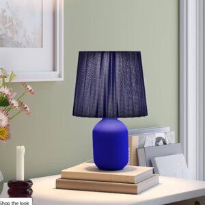 Elevate the look and feel of your living space with this Mini Ceramic Lamp from Room Essentials™. Featuring a ceramic body, this blue lamp has a drum-shaped shade crafted from a cotton-polyester blend. Featuring a 5-foot cord, this lamp is designed with an inline on/off switch. Add it to your living room or study for a cozy ambience.