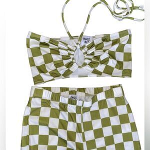 NWOT 2 piece Bando top and elastic waist, pants, olive and cream check motif size s