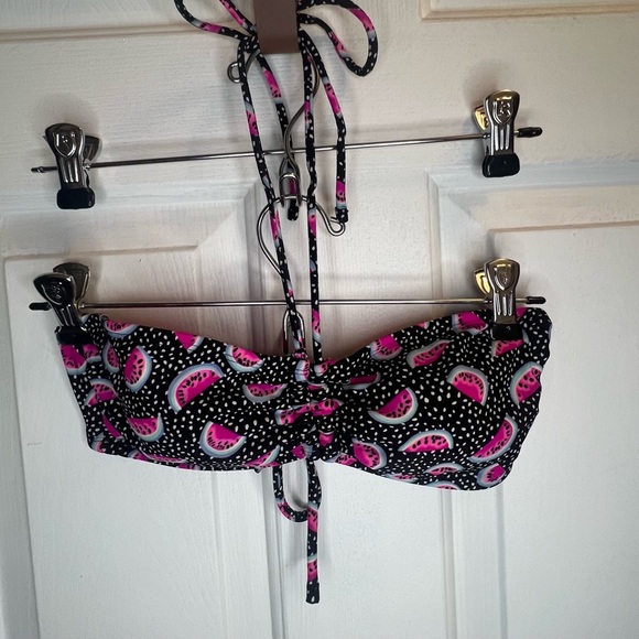 Stylish bikini set with a playful watermelon print. Features a black base with pink accents.