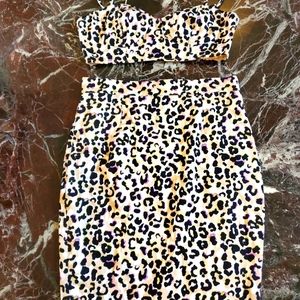Leopard Print 2 piece Set. Worn once for a fashion show. IN EUC! No holes, stains, fraying, pilling, etc. The skirt is a size large, and the bustier top is a size medium. The outfit was purchased from Forever21 4 years ago. Comes from a Smoke-free, Pet-free and vaccinated home.