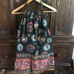 halter top is A line, one button closure at neck and elastic at top of back, 35" from neck to hem