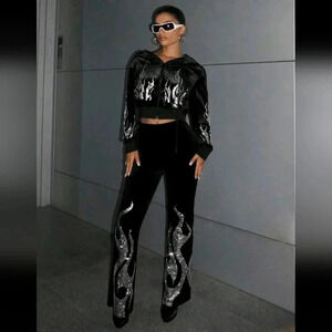 2 piece of set Bikercore Rhinestone Fire Pattern Crop Hoodie and Pants