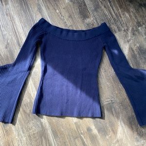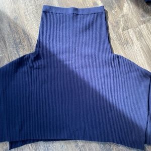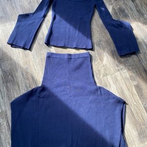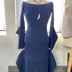 This is a 2-piece set made by BCBG. Off-the-shoulder ribbed sweater with 3/4 kimono sleeves. One ribbed below the knee length knit skirt in indigo blue. Original shape and design. the top is a size large (perfect for size 8 to 10 top) and the skirt is a medium. Both items stretch a lot over the body.