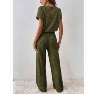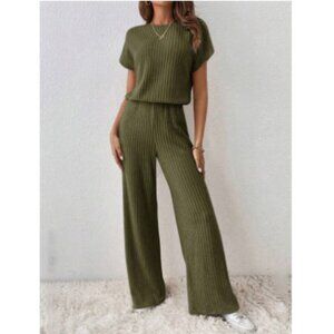 2 piece outfit tee shirt & wide leg pants lounge ribbed knit soft