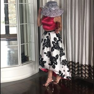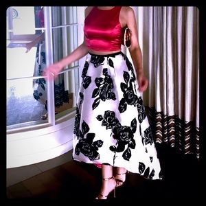 Black and white floral bottom with fuchsia under trim. Fuchsia sleeveless top.