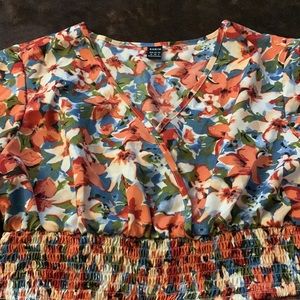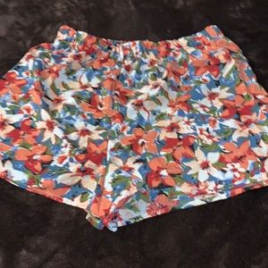 2 piece set. Too is a cropped top, pants are like paper bag shorts, high waisted. Floral.