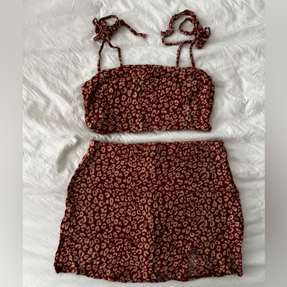 Crop top and mini skirt set. Back zipper on skirt. Elastic band on crop top with shoulder ties.