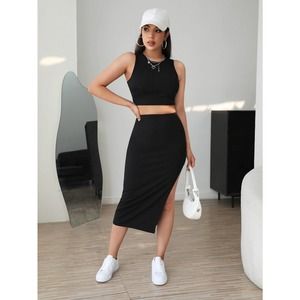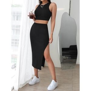 2 piece set: Tank crop Top & Split Thigh midi Skirt set black