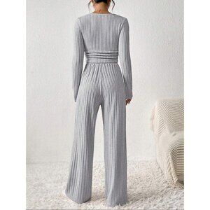 2 piece set: ribbed knit long sleeve tee & elastic waist pants lounge gray