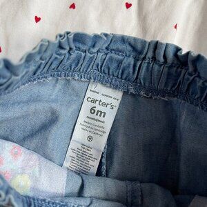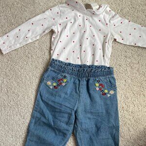 Heart long sleeve bodysuit from H&M size 4-6 months and a little denim, lightweight pants from Carter's size 6m. Worn once. No damage.