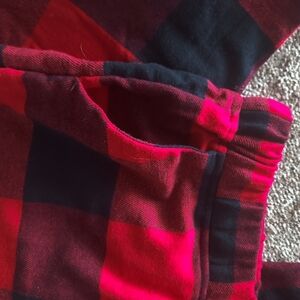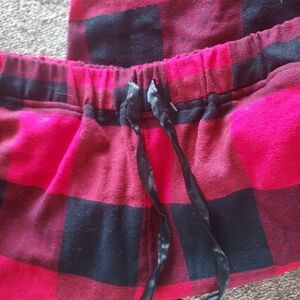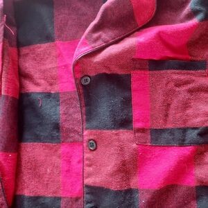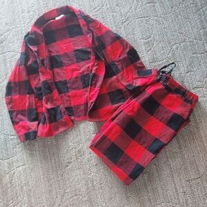 Black and red flannel pajamas. Never worn. Button up top with pocket. Pants have elastic waist with drawstring and pockets. very cozy.