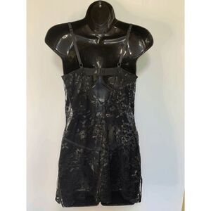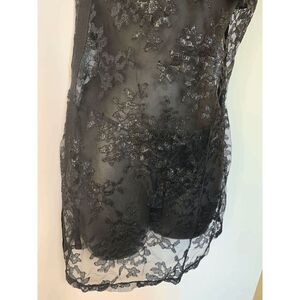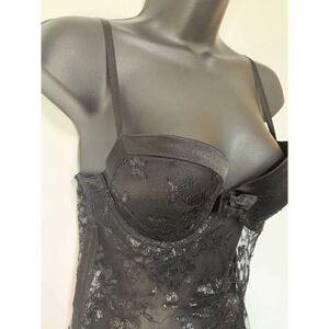 Excellent NWOT. black lace with silver detail, full wire padded bra top, sheer body and black lace matching G string panty