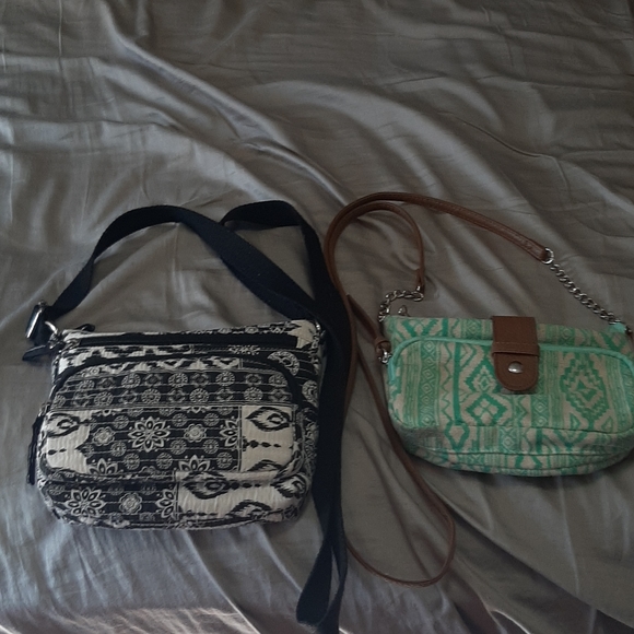 The one to the right is blue an white a little dirty and 2 pocket on the outside and one popocket in the inside.