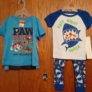The 1st set is a paw patrol shorts outfit featuring 2 of the dogs from paw patrol. It comes with a shirt and shorts. The 2nd item is shark attack pajamas also in size to