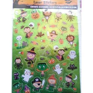 2 sheets Halloween Stickers Puffy & Shimmer Stickers 40 & 32 New in package. One sheet is puffy with 32 stickers and the metallic sheet has 40 stickers. Both are Halloween themed.