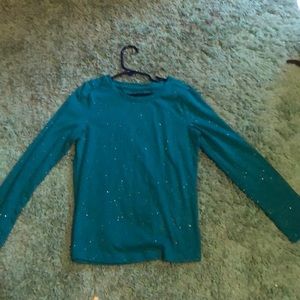 1 teal long sleeve shirt with silver sparkles and 1 quarter length gray shirt with a unicorn that has gold outline and clear sequence on the inside of the unicorn