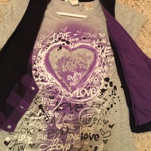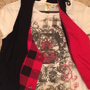 Two short sleeve graphic tees, both with matching vests! One white shirt w/ red and black design, red and black plaid vest included. One grey graphic tee w/ black, white, & purple design, purple and black plaid vest included
