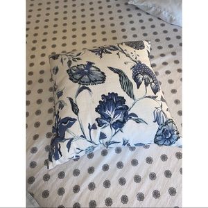 Second throw pillows is square with navy blue floral design on front and white on back bought for $16 from target