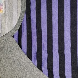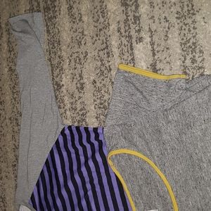 1 baseball style Randy tee with black/purple stripes and grey sleeves, the other is a short sleeved grey top with golden yellow trim. Light pilling on striped top because of washing. Barely noticeable. Great condition!