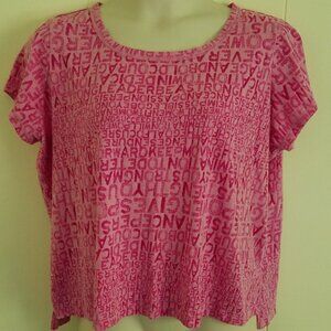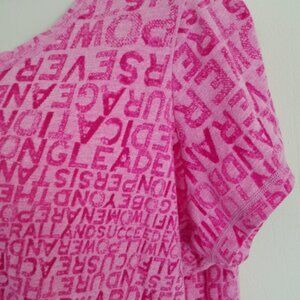 -Positive messages burnout tee! Xersion performancewear short-sleeved tee shirt, with hi-lo hemline and scoop neckline. Boxy cut, lettering is slightly see-through. Phrases include KEEP MOVING FORWARD and STRONG LEADER, and words like COURAGE, STRENGTH, DEDICATION and PERSEVERANCE. Fabric is soft and light. Measured flat this top is 24" long from shoulder to bottom hem and 27" across from armpit to armpit. Awesome sporty shirt in EUC.