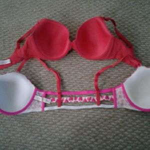 They are both brand new and never worn except for when i tried them on. Dissappionted that they were both too small for me :( both in flawless condition !! The bra with hearts on it clasps in the front and has a caged back.