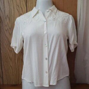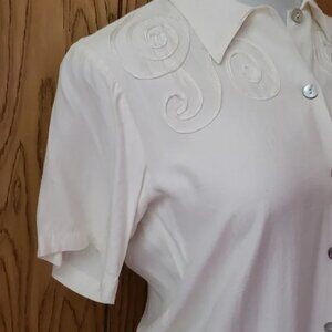 Vintage blouse by IOIO: Vintage collared blouse with same color flat ribbon embellishment. Very slight pilling noted also one spot as pictured. Shell buttons. Good condition.
