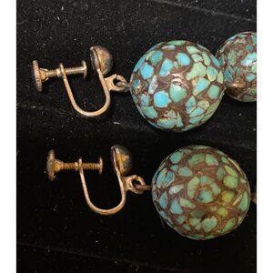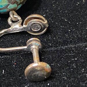 These vintage earrings from India feature a captivating turquoise mosaic design set in silver, showcasing the artistry of traditional craftsmanship. With a screw-back closure, these earrings provide a secure fit. Their unique style and antique charm make them a standout addition to any jewelry collection.