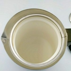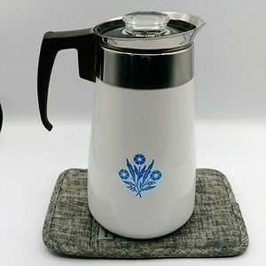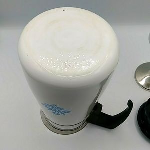 This is a complete stovetop coffee maker by Corning ware. It is in the Blue cornflower pattern. It comes with the original basket inside the coffee pot. The lid has its glass insert which fits great. There are minor scuffs to the outside of the coffee pot. There are no stains to the inside aluminum equipment, like the basket. But there is a stain on the inside white rim. See pictures. The handle has some fading. See pictures. The lid has been set on the stove and melted slightly, but still fits the top and is fully functional. Overall for a mid century coffee pot it looks very good. Holds 9 cups.