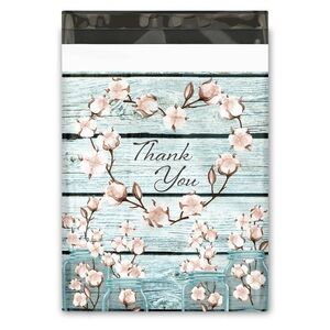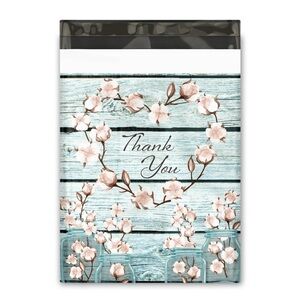 Set of 10x13 Cotton Designer Poly Mailers Shipping Envelopes Premium Printed Bags with 'Thank You' floral design on a light blue background. NIP