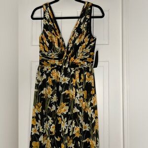 DESCRIPTION: Absolutely stunning maxi length dress. Beautiful floral - daffodil life pattern with metallic detailing. Flattering V-neckline and front lit. Last photos are stock - not my own. This dress in >used< condition has sold for $60-$110. This dress is NWT.