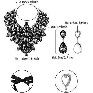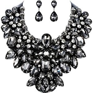 #20 Black Rhinestone Crystal Statement Necklace Earrings Set Cabochon Encrusted