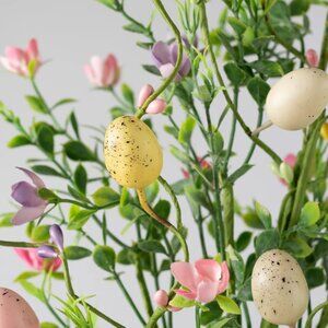 This spray has eight branches. The branches contain different combinations of pretty Easter filler - tiny flowers, pips and speckled Easter eggs. The flowers are silk and come in two shades of pink and purple. They are accompanied by plastic leafy stalks. The Easter eggs are foam with semi-matte paint in pink, yellow and cream. The pips come in yellow, purple, pink, and pastel green. Cut apart and use these branches to add touches of Easter appeal to floral designs.