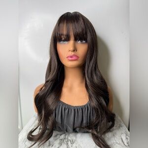Description: Achieve a beautifully natural look with this 20 inch long synthetic wig in a rich brown shade. Designed to look and feel just like real hair, this wig has soft, loose waves and trendy bangs that perfectly frame the face for an effortlessly chic style. The high-quality synthetic fiber mimics natural hair’s texture and shine, making it almost indistinguishable from real hair! The wig is made with a breathable rose net cap for all-day comfort, and the 100% density offers full yet realistic volume. The loose waves hold their shape with minimal.