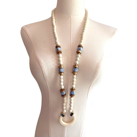 Elevate your style with this boho statement necklace featuring smooth white bone colored beads, natural wood accents, and striking blue-and-white 'porcelain' chinoiserie beads. The bold crescent pendant adds an artisan touch, making it perfect for layering or wearing alone as a standout piece. A versatile long necklace that blends vintage-inspired elegance with modern boho charm.