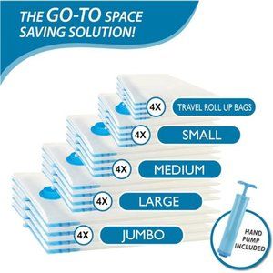 🧿20 PACK INCLUDES: 4 Jumbo: 39.35” X 27.5”(100cm X 70cm); 4 Large: 33.5” X 21.65”(85cm X 55cm); 4 Medium: 27.5”X 19.5”(70cm X 50cm); 4 Small: 23.5”X 15.7” (60cm X 40cm); 4 Travel Roll Up (No need vacuum holes): 23.5”X 15.7” (60cm X 40cm)