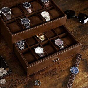 20 Slot Watch Box Organizer Display Case Glass Lid Leather Storage for Men