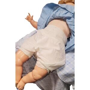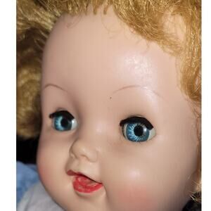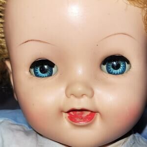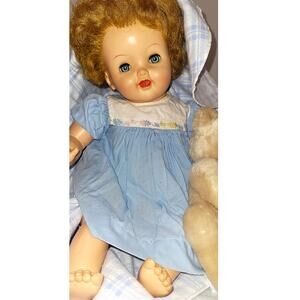 This is a 20" Sweet & Cuddly 50's Vintage "Cuddles Up" Drink, Wet, Cry Baby Doll, with Vinyl Head, Arms & Legs. It also comes with Oil Cloth Stuffed Body and an Open Mouth Smile. This doll has the most Beautiful Sparkling Aqua Blue Eyes. Included with the doll is a Bear and a Blanket.