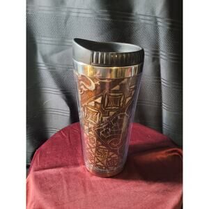 Copper and silver tribal designs on the cup. The brand is called "the pictures mug". It is a 20 oz cup. Very classy looking in great condition.