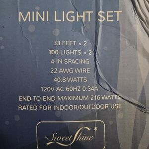 Specifications ☀ Each package contains 2 strands of black wire string lights, 33 feet per strand with 100 green lights. Total length 66 feet with 200 lights. 5 inch lead, 4 inch spacing, 5 inch tail. Incandescent Christmas Lights offer superior quality at affordable prices making them the ideal choice for a variety of lighting projects.