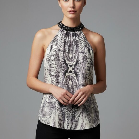 $200 HAUTE HIPPIE vintage NEW! silk top with studded lamb suede collar