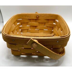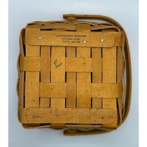 The product is a 2000 6 inches square Longaberger basket with a handle, standing at 3 inches tall. Made of wood and featuring a brown color, this medium-sized storage basket is designed with a square shape and comes with a handle for easy transport. Handmade in the United States, this original Longaberger basket is perfect for all occasions and can be displayed in any room of the house, adding a touch of charm to any decor. In very good condition.
