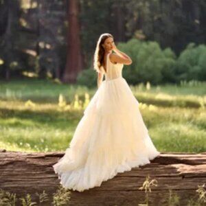 This stunning wedding gown features a deep V-neckline and delicate straps, offering a modern yet timeless silhouette. The full ballgown skirt is crafted from layers of soft tulle, creating ethereal volume and movement with every step. A cinched waist enhances the bride’s figure, adding elegance and grace to the overall design. Perfect for a romantic outdoor or fairytale-inspired wedding, this dress makes a breathtaking statement.