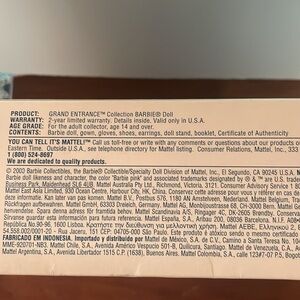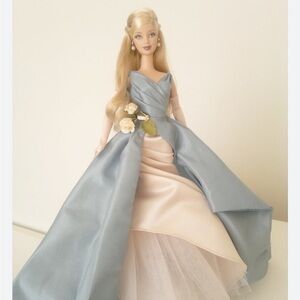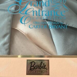 2000 Grand Entrance Barbie by Carter Bryant 1st in Series. Grand Entrance Barbie wears a steel blue taffeta gown with a fitted bodice and long, full skirt with an underskirt of blush satin and ivory/pale pink tulle. Beautiful blush roses at her waist, and long blush gloves accent this classic look. The finishing touches include blush pumps, and rhinestone and faux pearl earrings. The premier doll in the series devoted to Barbie collecting comes with a Guide to Collecting, and a Certificate of Authenticity.