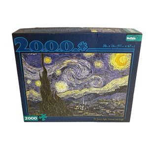 Experience the beauty of Vincent Van Gogh's masterpiece, "The Starry Night," with this 2000 piece jigsaw puzzle from Buffalo Games. This puzzle features multi-colored pieces and measures 26.75" x 19.75" when completed. The puzzle is complete and in excellent shape, ready for you to enjoy. Bring this art-themed puzzle into your home today and add it to your collection. See pictures, please. Ships quickly