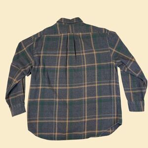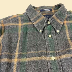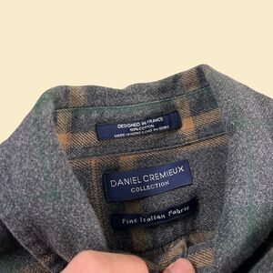 Vintage flannel button down mens shirt, manufactured ca. 2000s by Daniel Cremieux. Grey, green, and brown plaid pattern with medium weight fabric, front pocket, long sleeves, and collar. Size tag missing; fits like a mens XL.