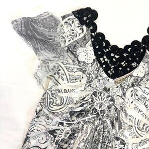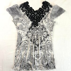 2000s Energe Black White Floral Paisley Top Rhinestones Lace Sz PS Alt Boho